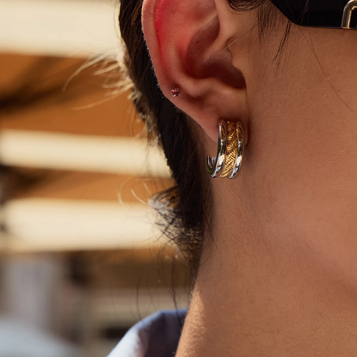 Inspirées de la modernité chic et vibrante de la ville catalane, les boucles Barcelona marient avec audace les tons argenté et doré, pour une allure sophistiquée et contemporaine. Leur design incurvé est rehaussé d’une tresse dorée centrale qui capte la lumière à chaque mouvement.