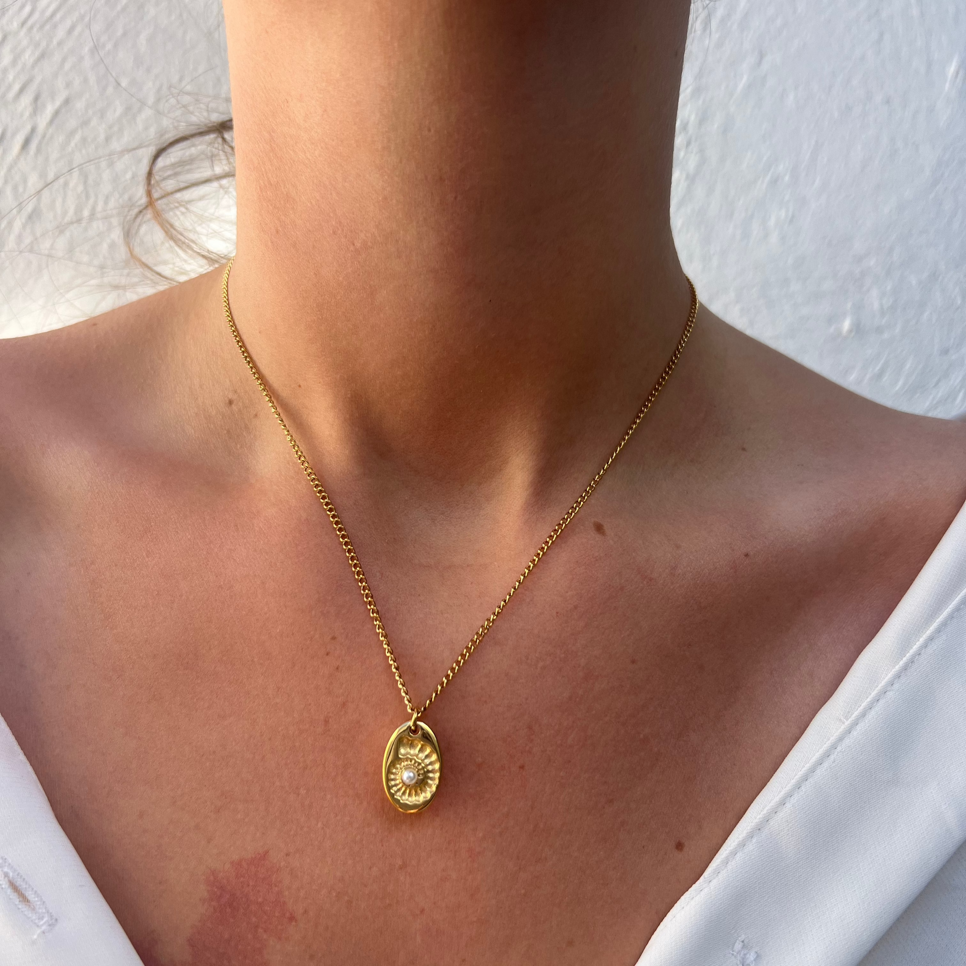 Sublimez votre cou avec le collier Sicilia, une pièce à la fois solaire et délicate. Son médaillon doré irrégulier, inspiré des formes organiques des trésors marins, accueille en son centre une perle nacrée lumineuse. Le motif gravé évoque un soleil en mouvement, symbole d’énergie et de féminité.